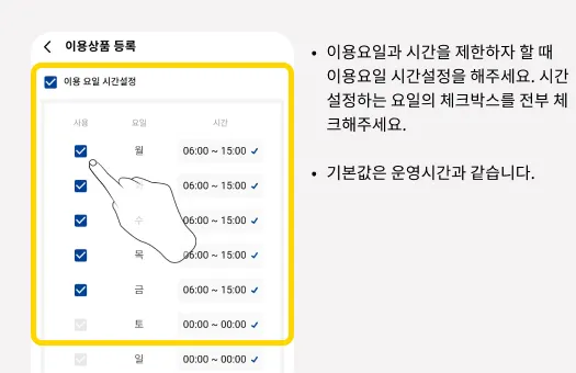 상품에 이용요일과 시간을 제한하고자 한다면, ‘이용요일 시간설정’을 선택해 이용요일과 시간을 설정합니다. (기본값은 센터 운영시간과 동일합니다)