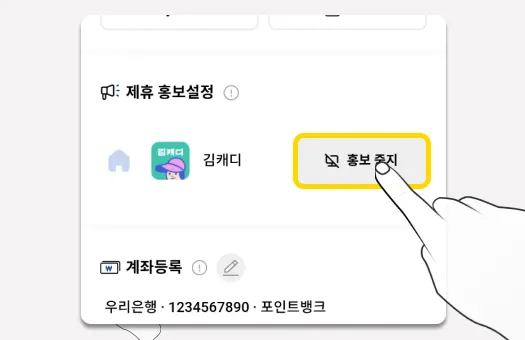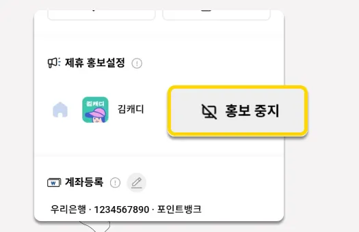다음과 같이, ‘홍보중지’로 표시가 된다면 제휴 홍보설정이 완료된 것입니다.