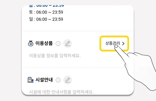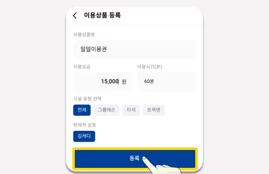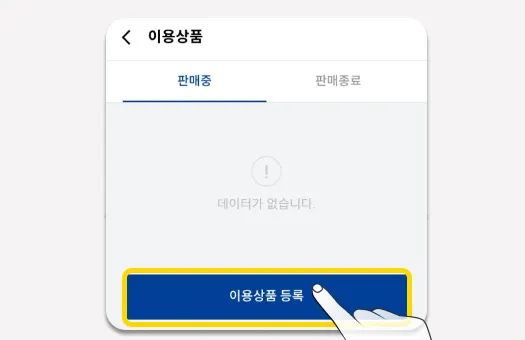상품등록 페이지에서, 하단 ‘이용상품등록’ 버튼을 선택합니다.