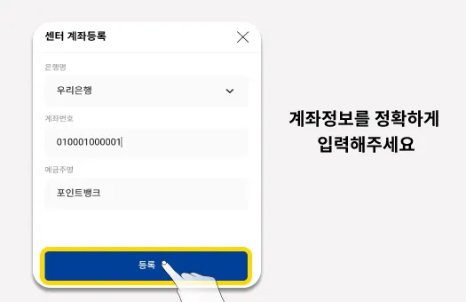 은행명 / 계좌번호 / 예금주명을 정확하게 입력하신 후, ‘등록’버튼을 눌러, 센터 계좌등록을 완료합니다.