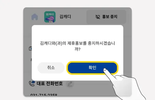 ‘확인’버튼을 눌러 홍보를 중지합니다.