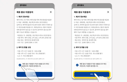 약관 동의 페이지에서, 이용안내 및 약관을 읽어보신 후에, 이용동의를 하신다면 ‘동의’를 체크하신 후, ‘확인’버튼을 눌러 홍보등록을 완료합니다.