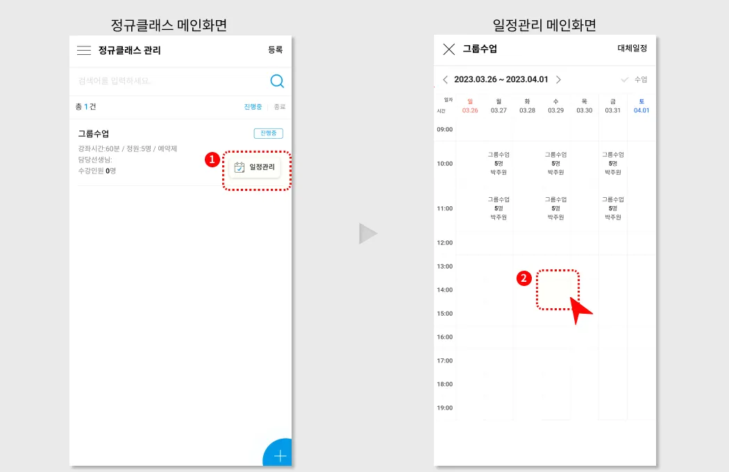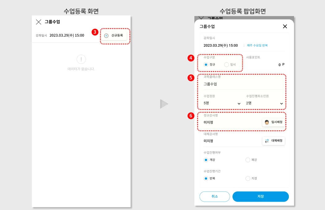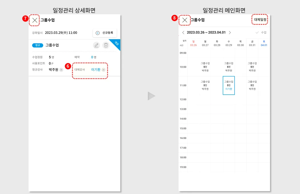 갑자기 강사님이 수업을 못하게 되거나, 임시로 강사님을 대신 배정해야할 경우에 대체강사배정 기능을 사용합니다.