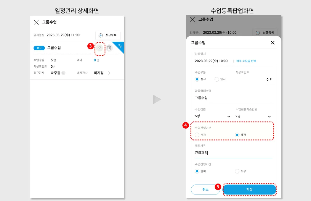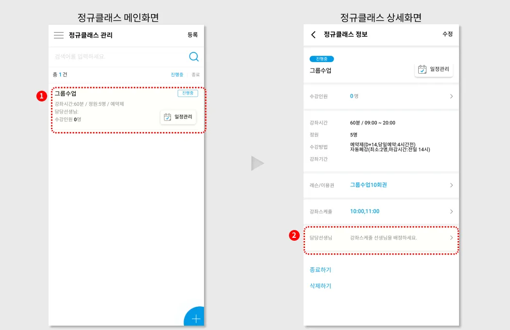 수업을 삭제하는 것이 아니라, 사정(명절, 임시휴관, 강사의 사정 등)에 의해 쉬어야할 경우 클래스 정보를 수정할 수 있습니다.