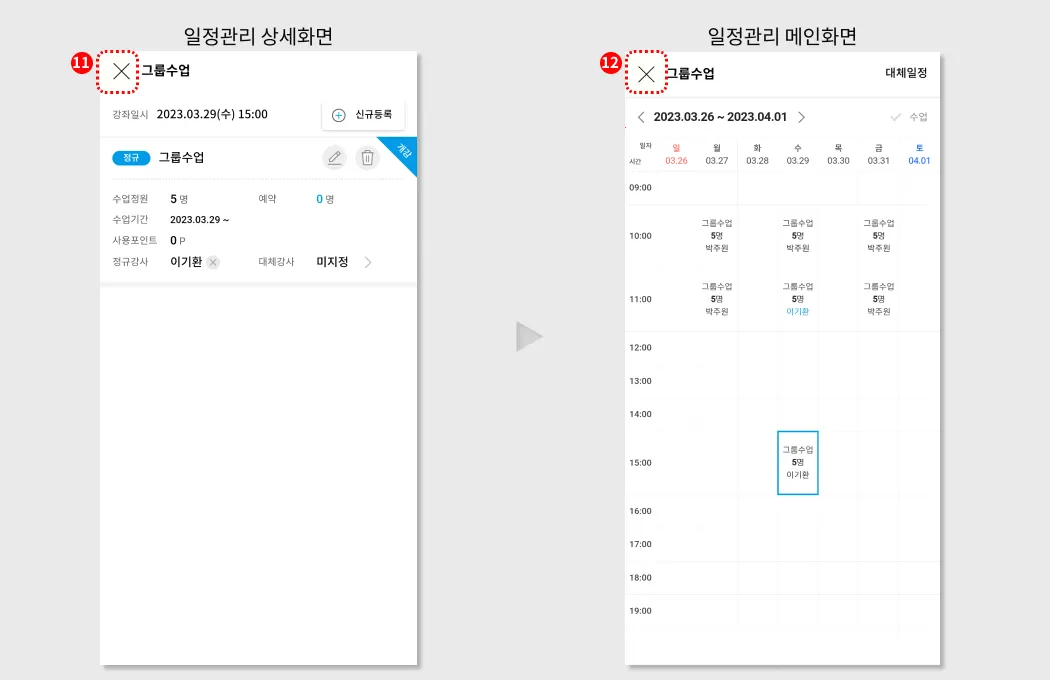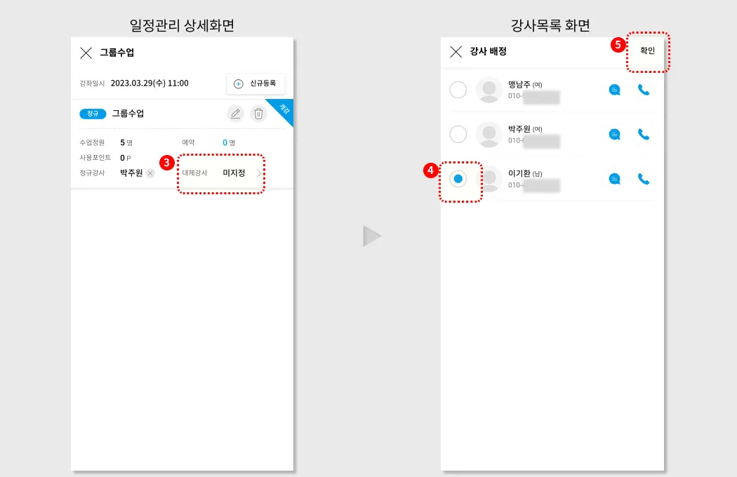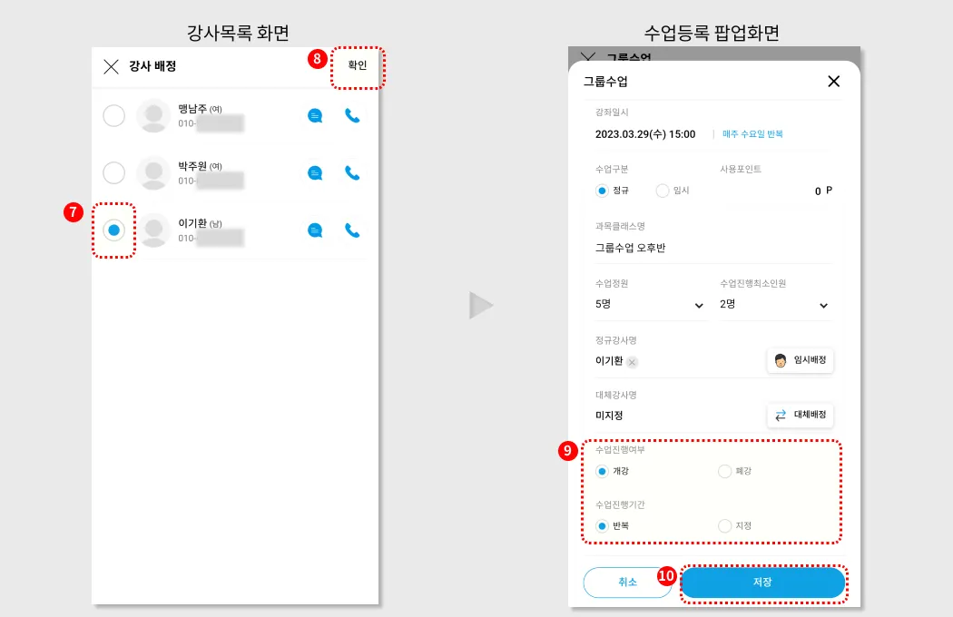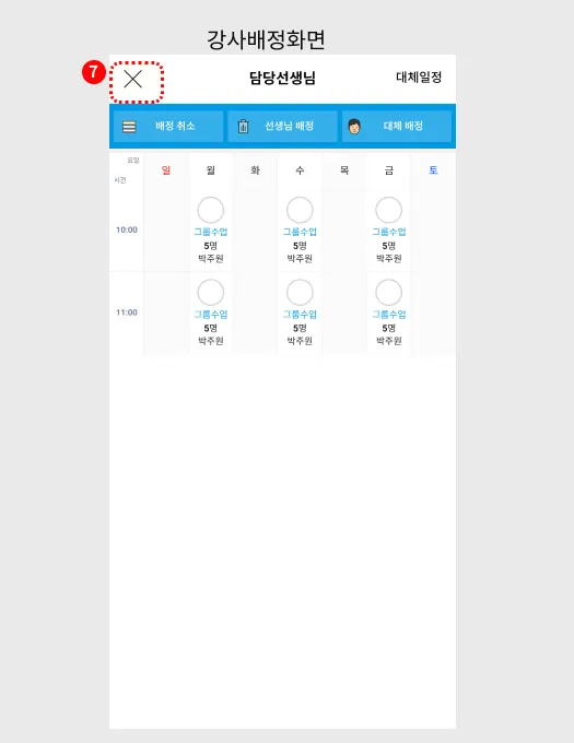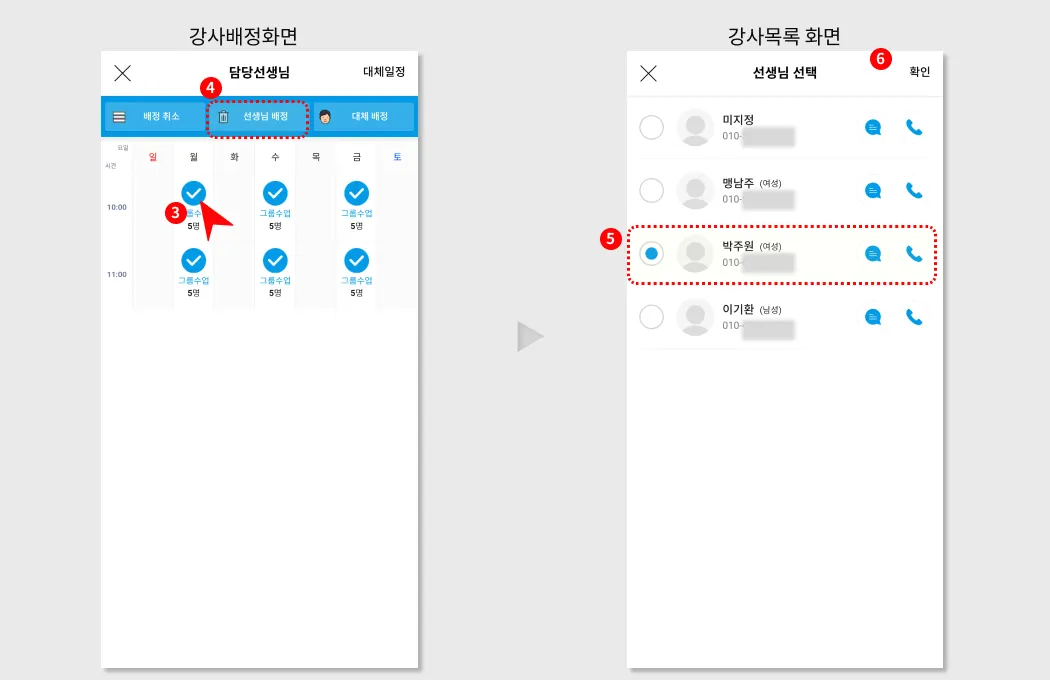 강사목록화면에서 배정할 강사를 선택합니다. (시간마다 강사가 다를 경우, 4번5번을 반복합니다)