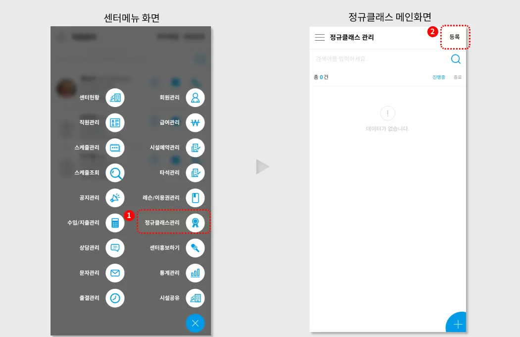 센터메뉴화면에서, 정규클래스관리를 선택해주세요.