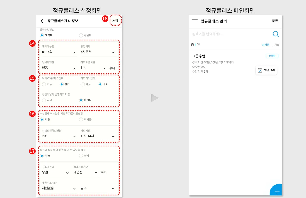정규클래스는 그룹수업입니다. 필라테스나 헬스등의 센터에서 사용하는 지정시간표에 여러명이서 수업을 들을 수 있는 수업입니다. 개인레슨과는 별개로, 센터 운영시간내에 개설할 수 있습니다.