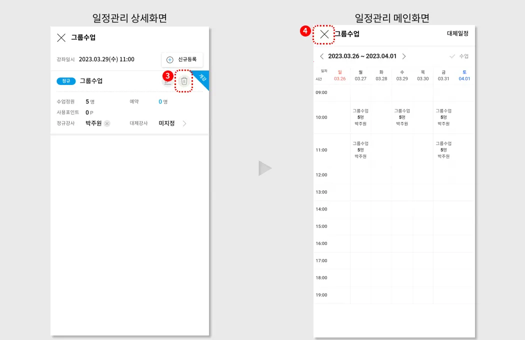 일정관리 상세화면에서 휴지통을 선택해, 삭제합니다.
