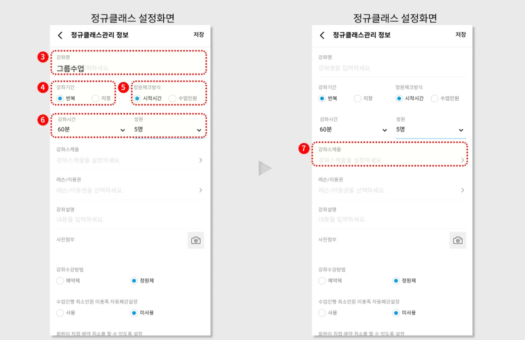 강좌명, 수업정원, 수업진행 최소인원을 설정합니다.