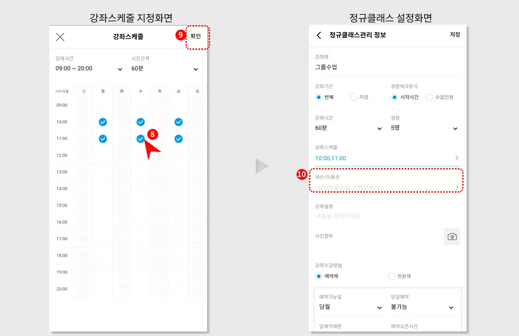 ‘강좌시간’을 정하고 ‘정원’을 지정합니다.