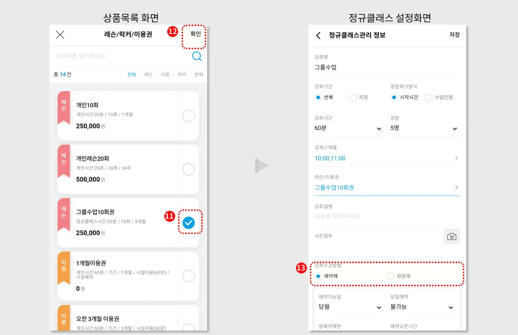 개설하는 강좌의 수강방법을 정합니다. 회원이 직접 예약하도록 하려면 ‘예약제’로, 센터장님이 일정등록을 하는 방식으로 운영하시려면 ‘정원제’를 선택합니다.