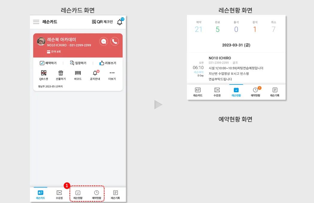 예약현황(기본값)을 선택합니다. (레슨기록을 선택하면, 회원의 레슨기록을 확인할 수 있습니다)