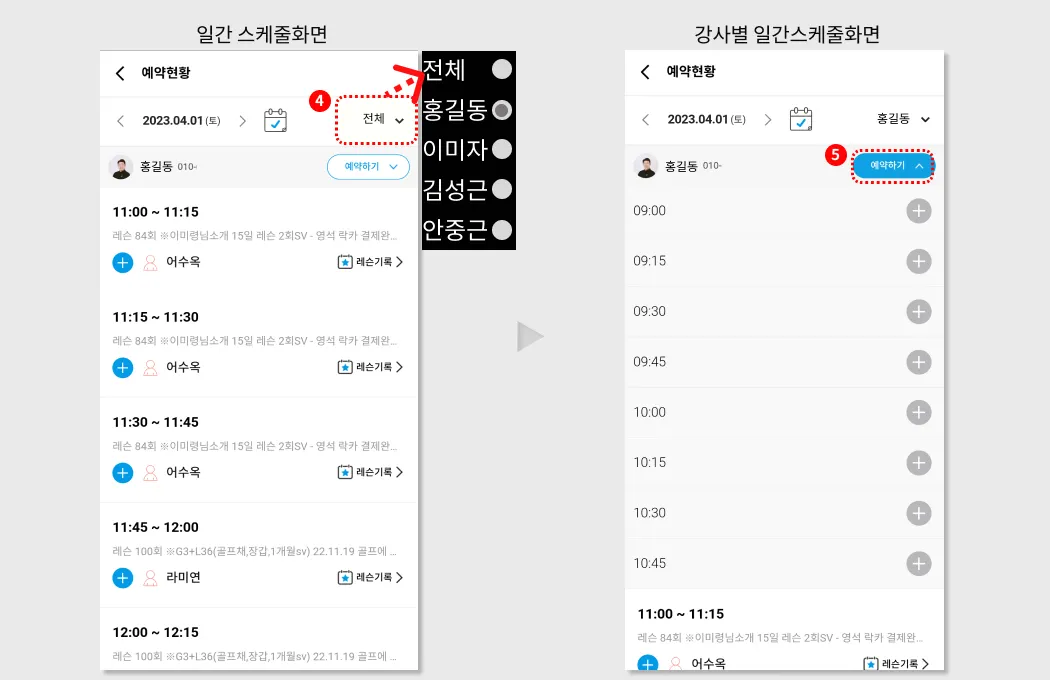 강사일간스케줄화면에서, 예약하기를 선택해, 타임테이블을 펼치고 빈시간을 선택합니다.