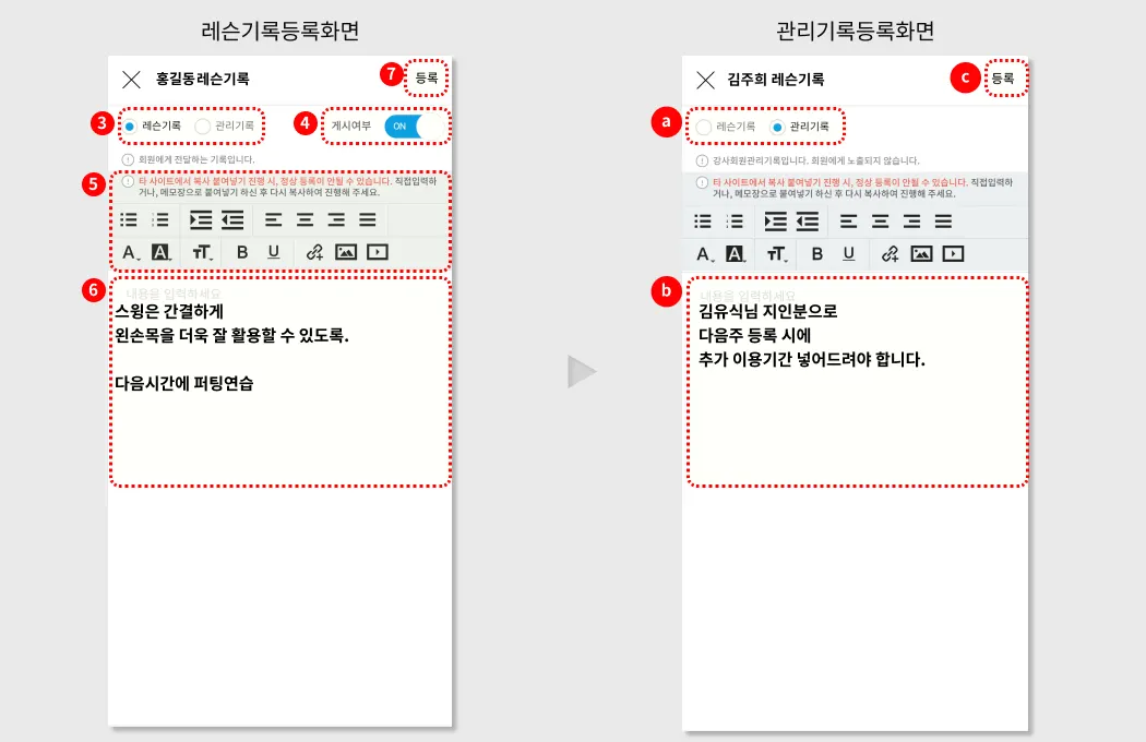 ‘등록’버튼을 눌러, 레슨기록 작성을 완료합니다.