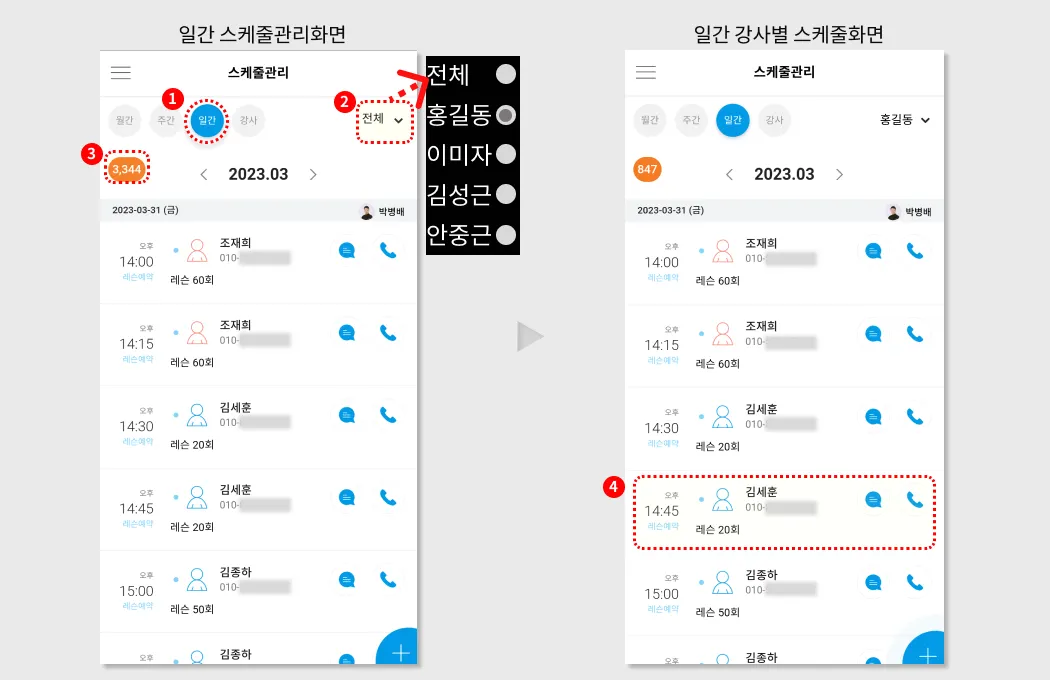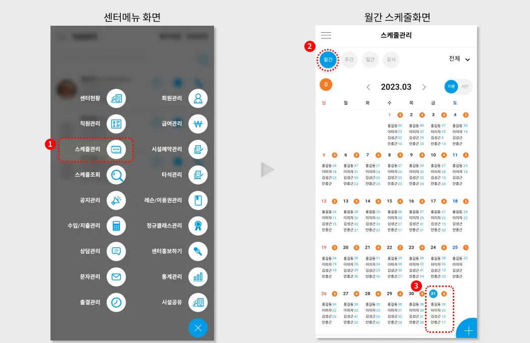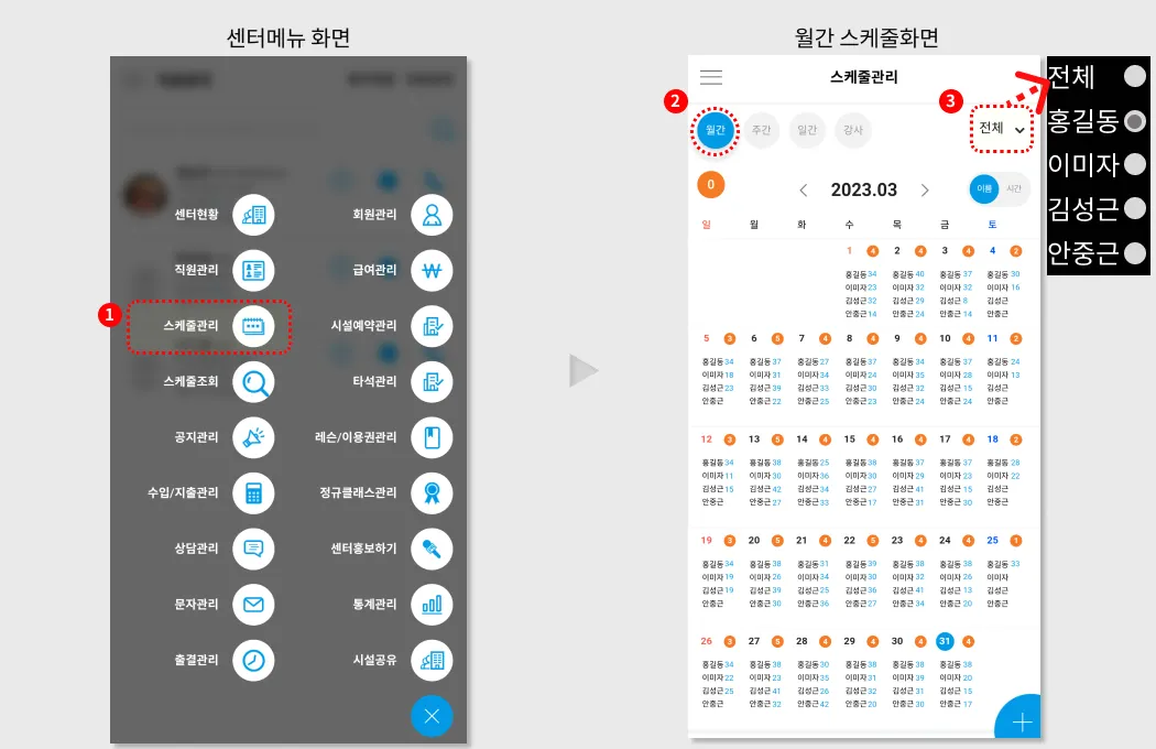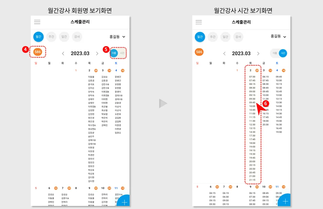 스케줄관리화면에서, 예약된 스케줄을 월간/주간/일간/강사별로 확인할 수 있습니다.