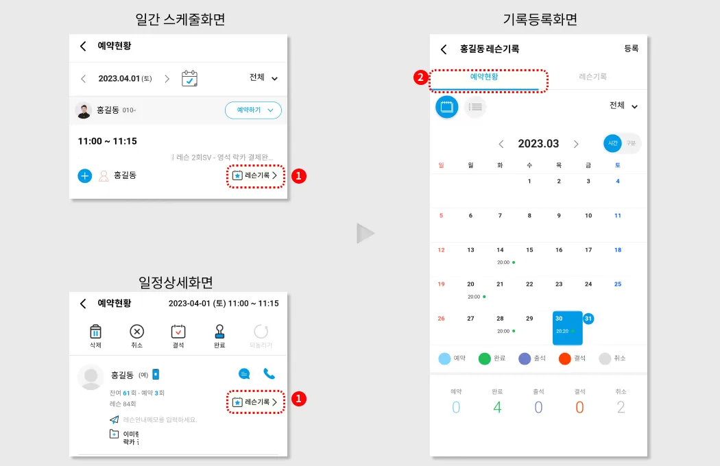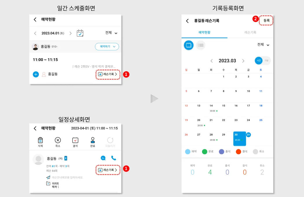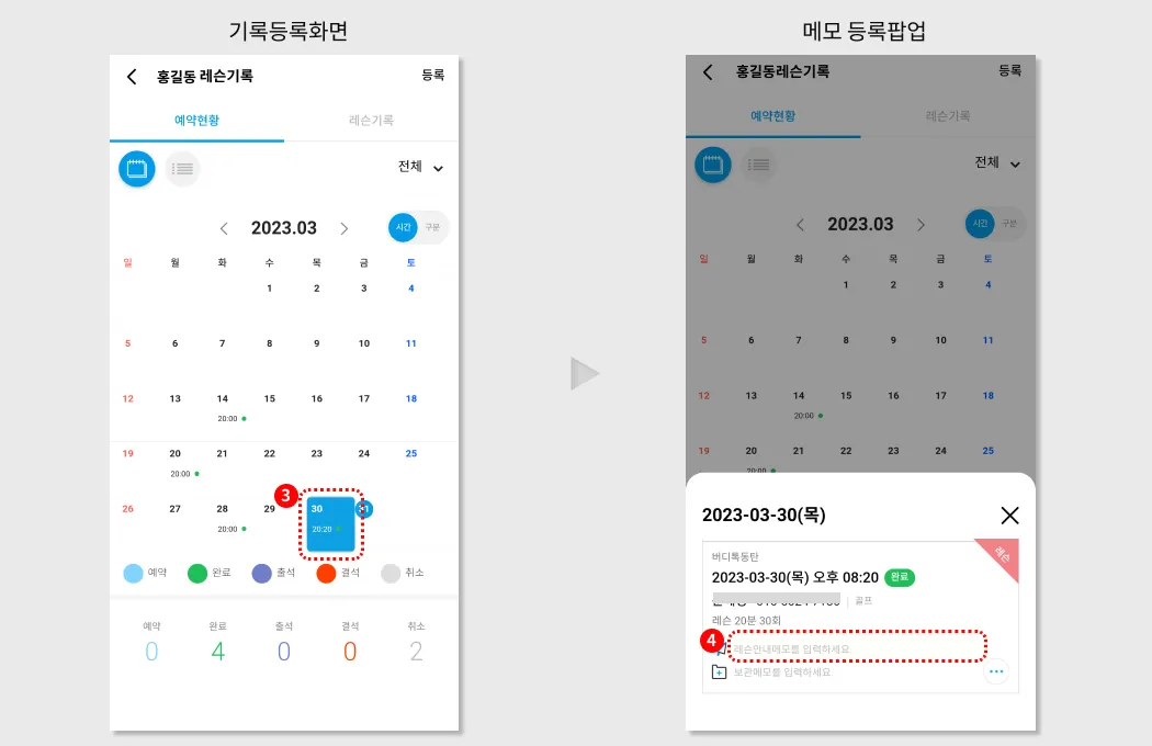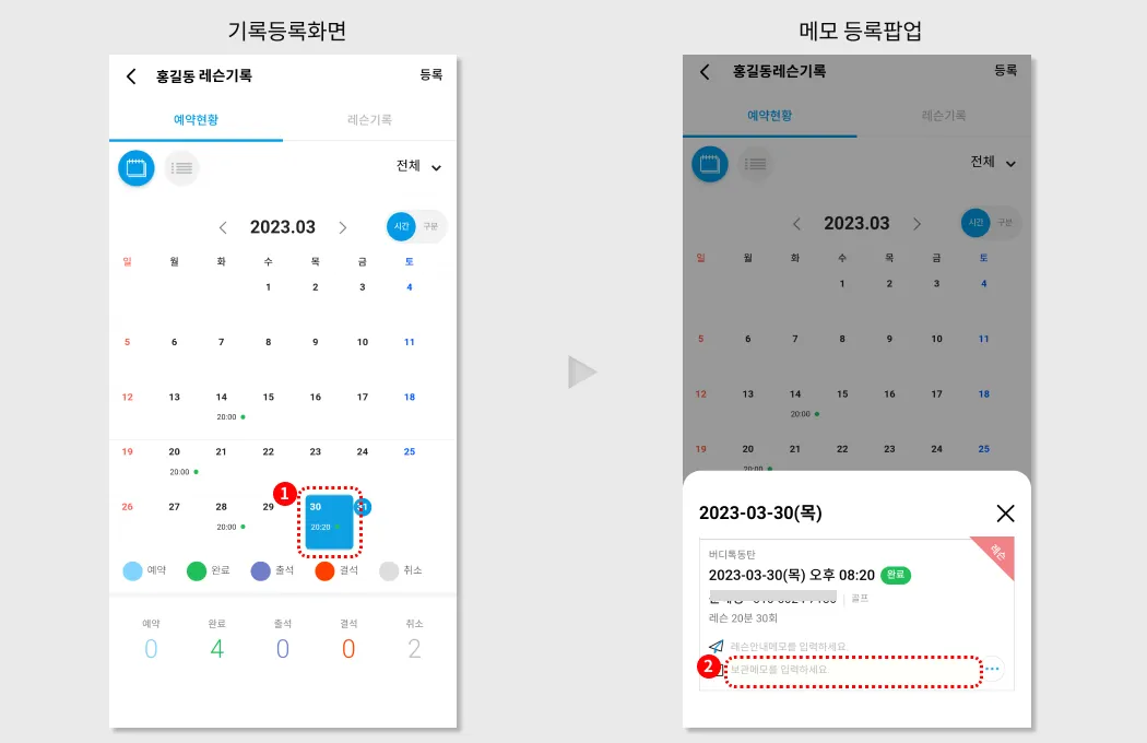 월간,주간,강사별 스케줄보기 화면이나 일정상세화면에 ‘레슨기록’ 버튼을 눌러, 레슨기록/메모 등록화면을 호출합니다.
