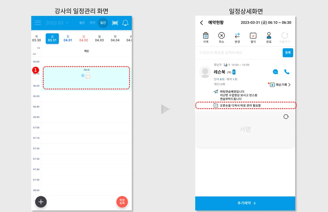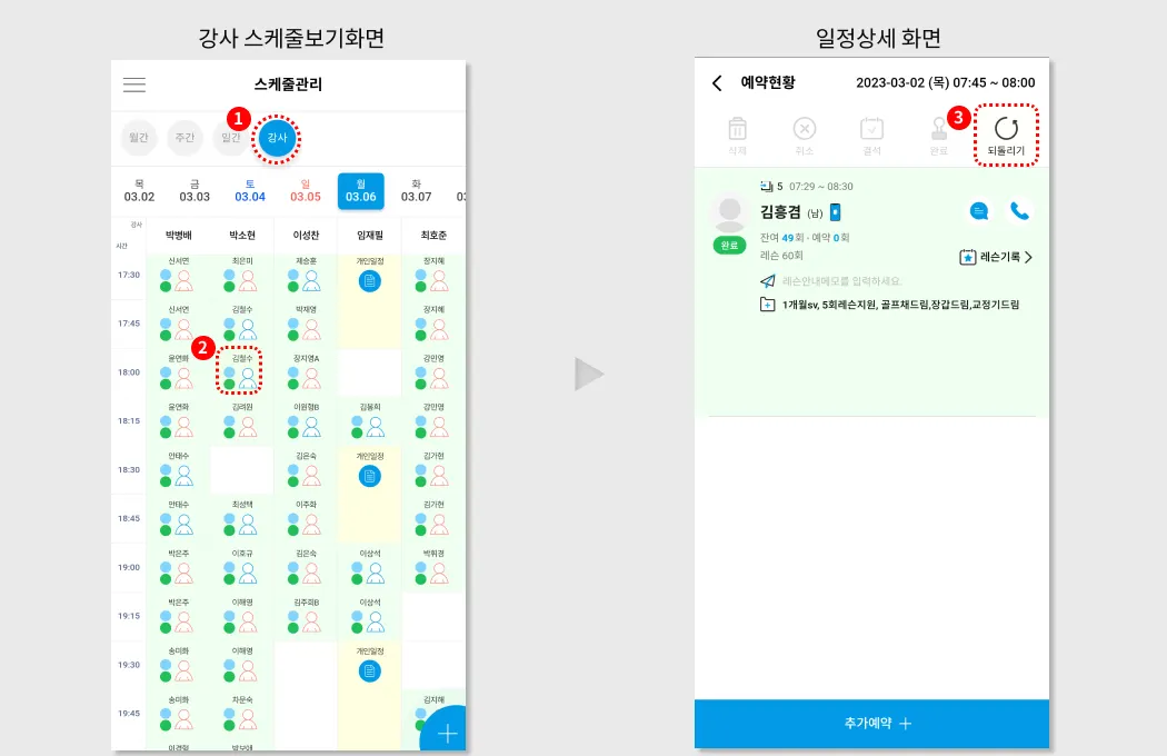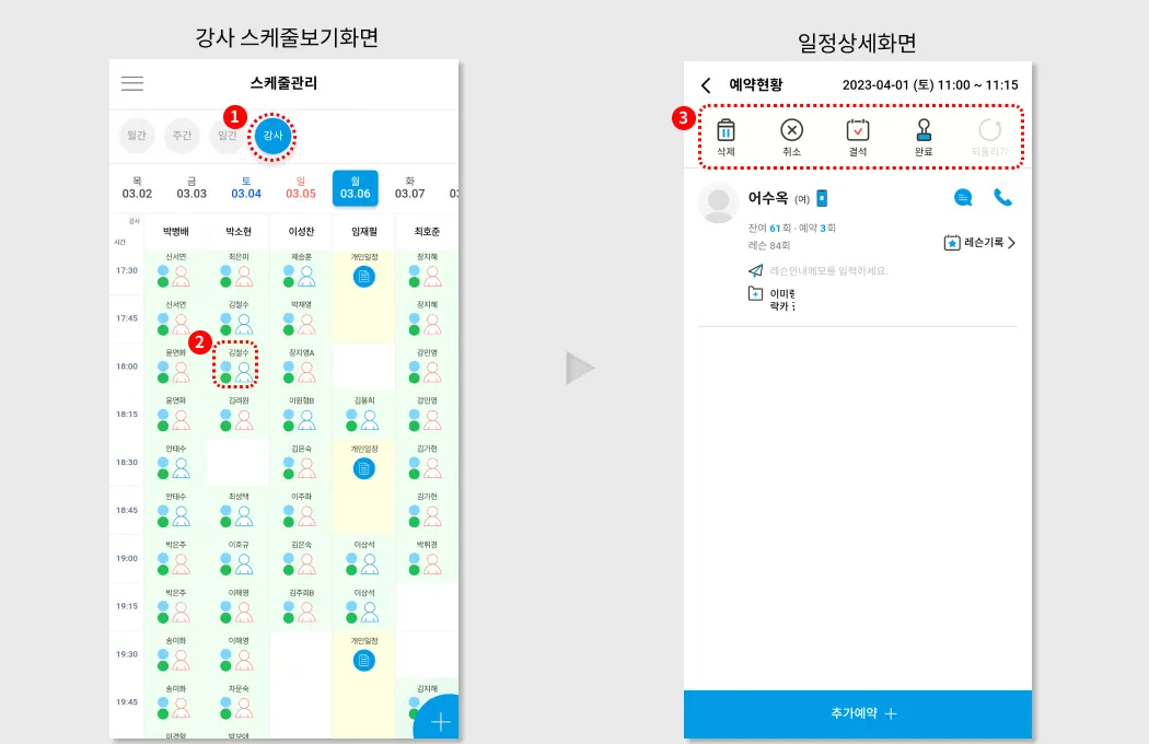 주간 강사별 스케줄화면에서, 일정을 선택하면, 일정상세 보기화면을 호출합니다.