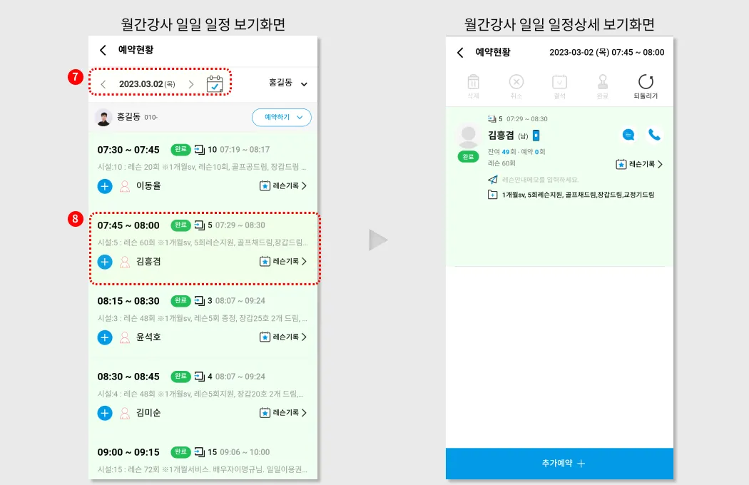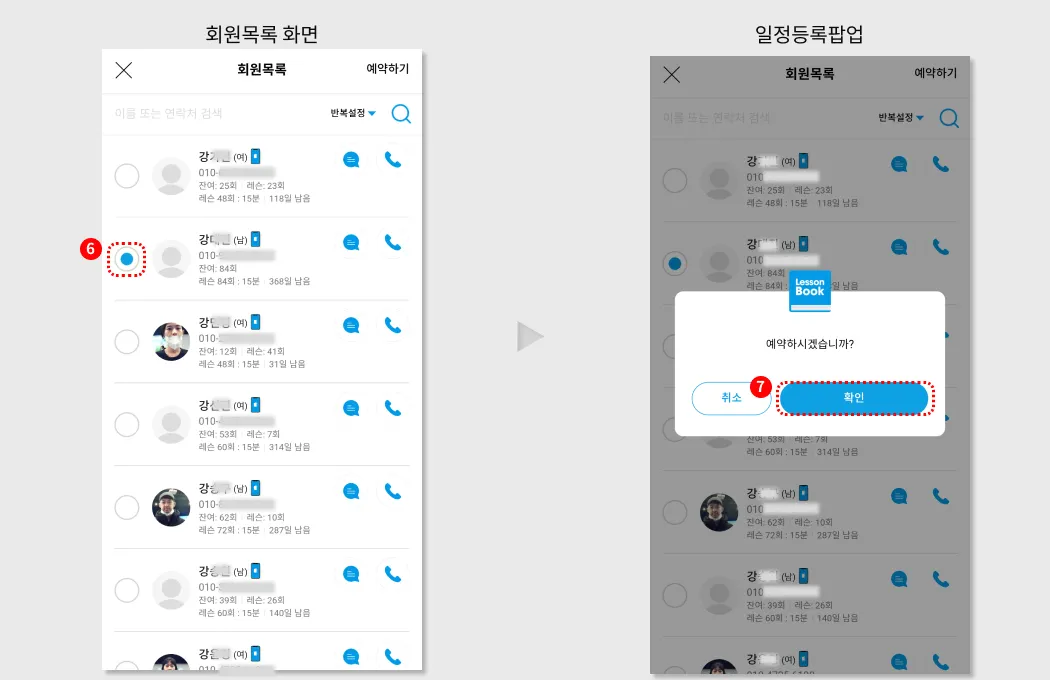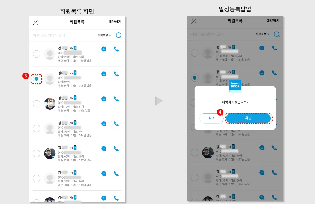 빈시간을 선택해 회원목록을 호출한 후에, 회원을 선택합니다.