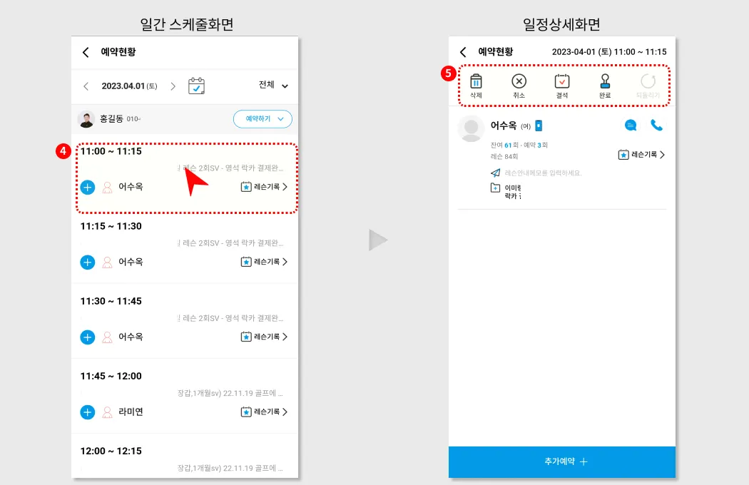 일간 강사별 스케줄화면에서, 일정을 선택하면, 일정상세 보기화면을 호출합니다.