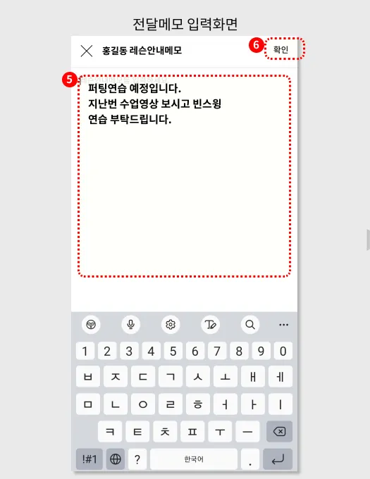 ‘레슨안내메모’를 선택해, 회원에게 전달할 메모입력화면을 호출합니다.