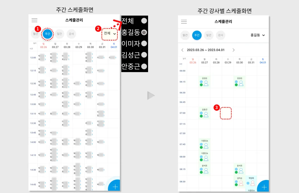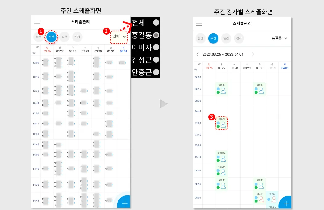 강사를 선택합니다. 강사의 주간 스케줄화면을 호출합니다.