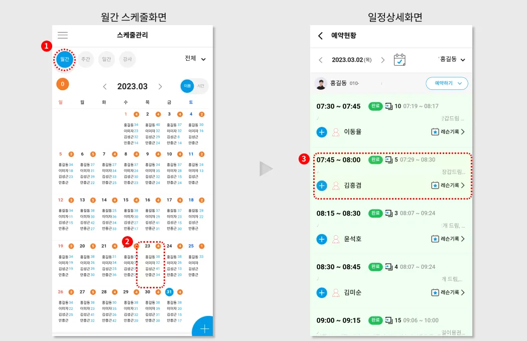 빈 곳을 선택하면 회원목록을 호출해, 일정을 등록해줄 수 있습니다.