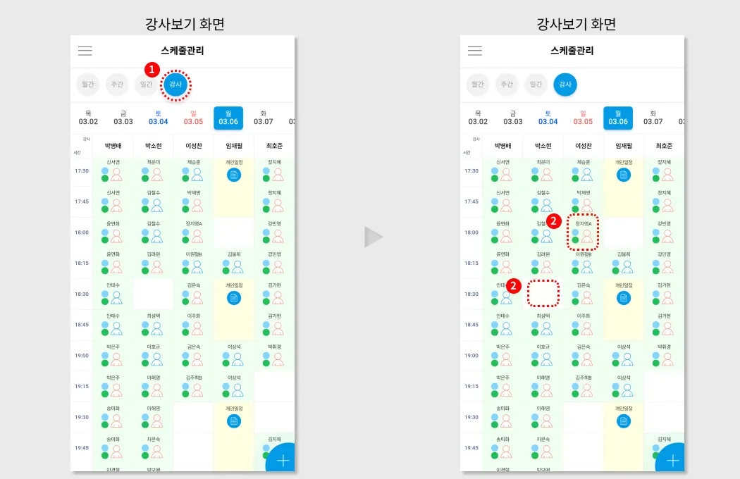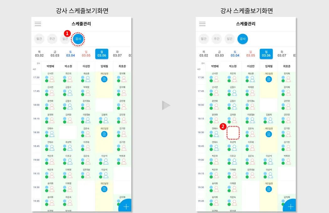 스케줄관리로 들어가 상단탭에서, ‘강사’를 선택하면, 강사별 일간 타임테이블을 호출합니다.