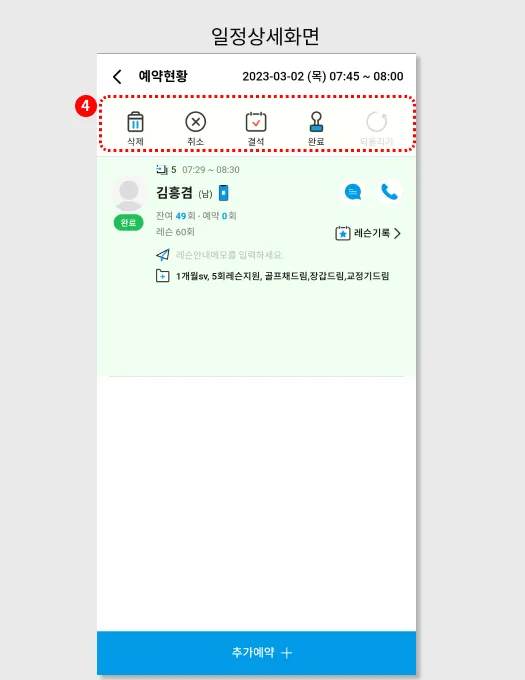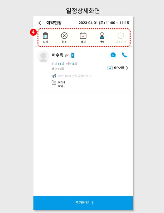 상단의 상태메뉴에서, 삭제/취소/결석/완료 처리를 합니다.