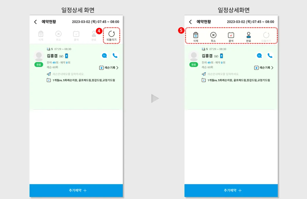 일정상세화면에서, ‘되돌리기’를 눌러 일정을 복원합니다.