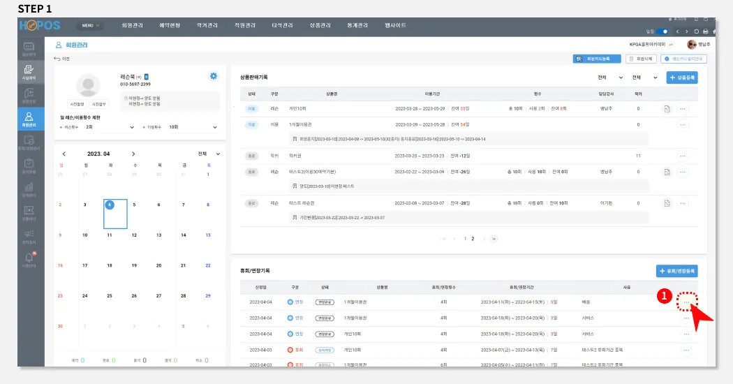 개별 회원의 휴회처리를 합니다. 회원의 보유 수강권별로 휴회처리를 할 수 있습니다.