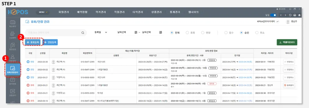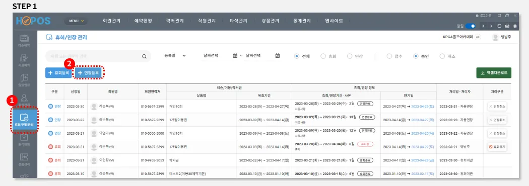 회원관리 > 회원상세 페이지에서 휴회/연장을 등록할 수 있습니다.
