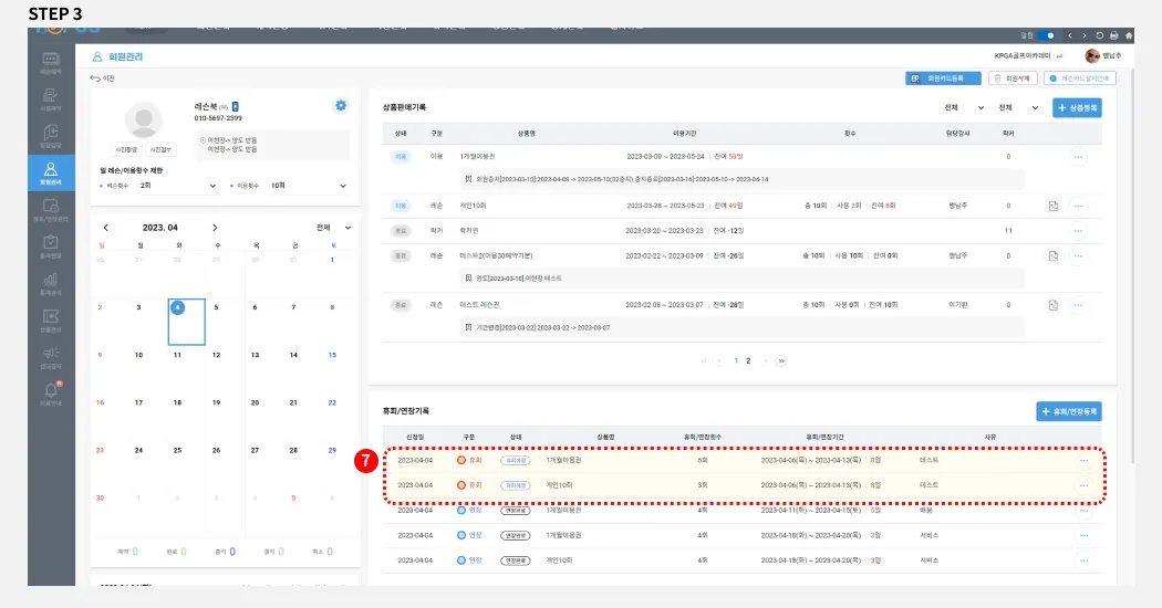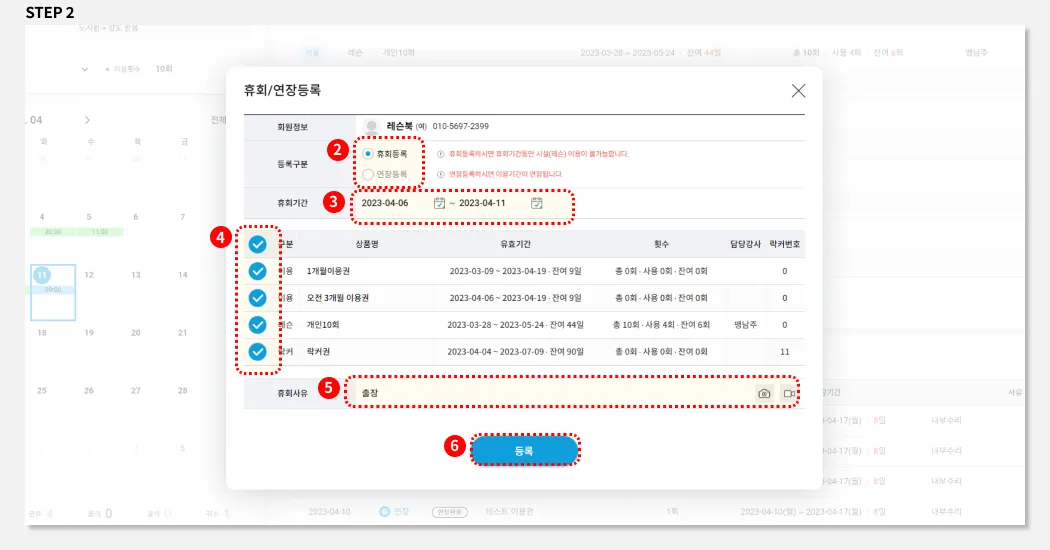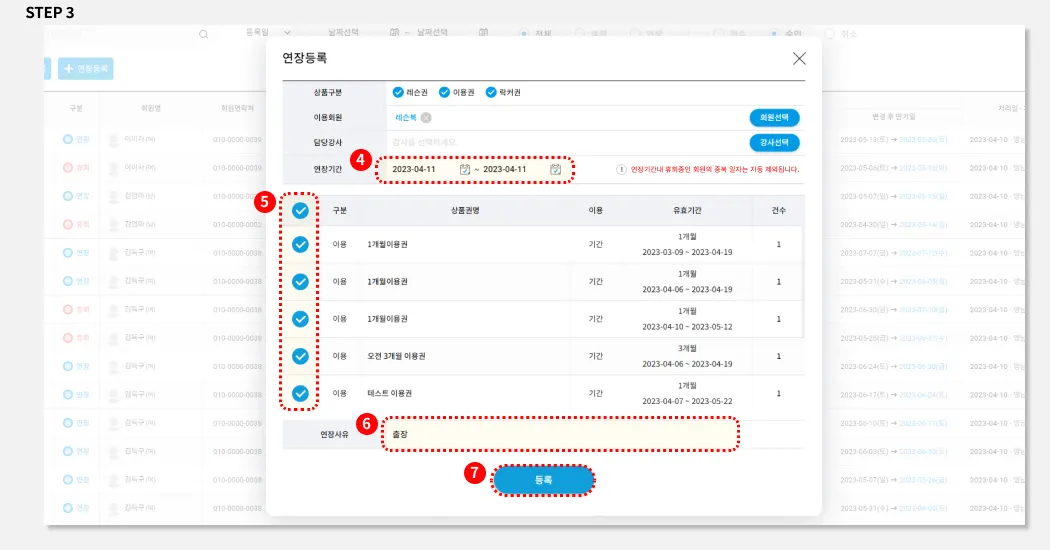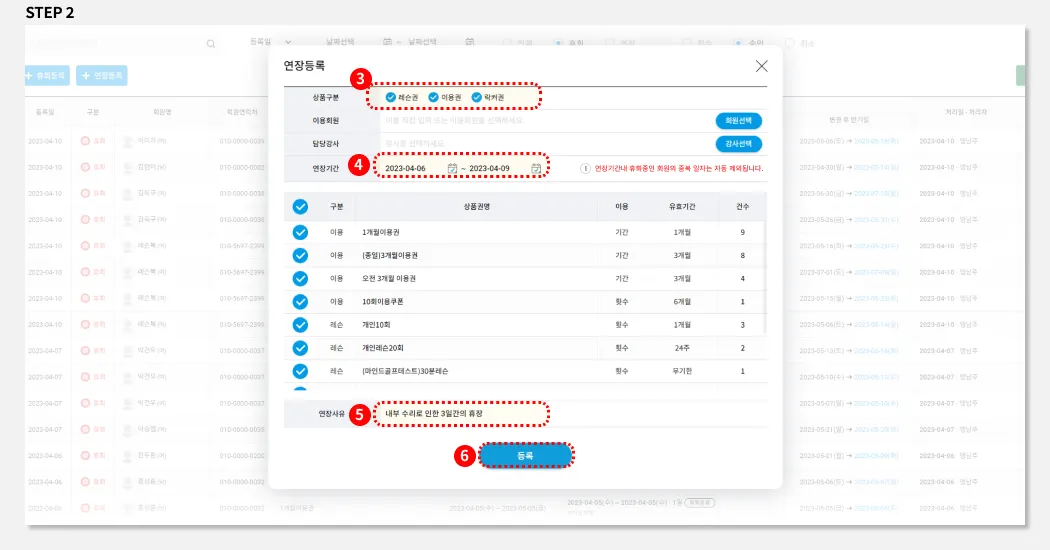 특정회원의 수강권기간 연장이 필요할 때, 연장등록을 할 수 있습니다. 회원 한사람 한사람의 연장기록 관리를 위해, 연장사유를 등록합니다.