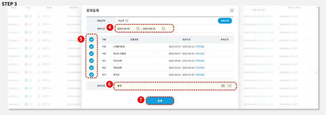 휴회기간을 등록합니다. (휴회기간이 겹치게 등록할 수 없습니다 - 불가 메세지창이 뜹니다)