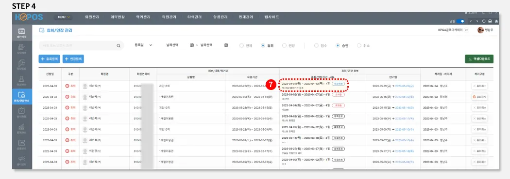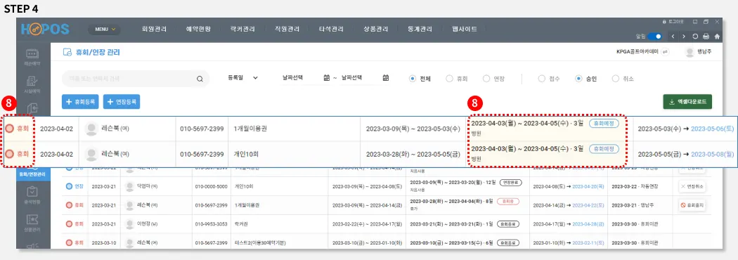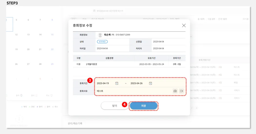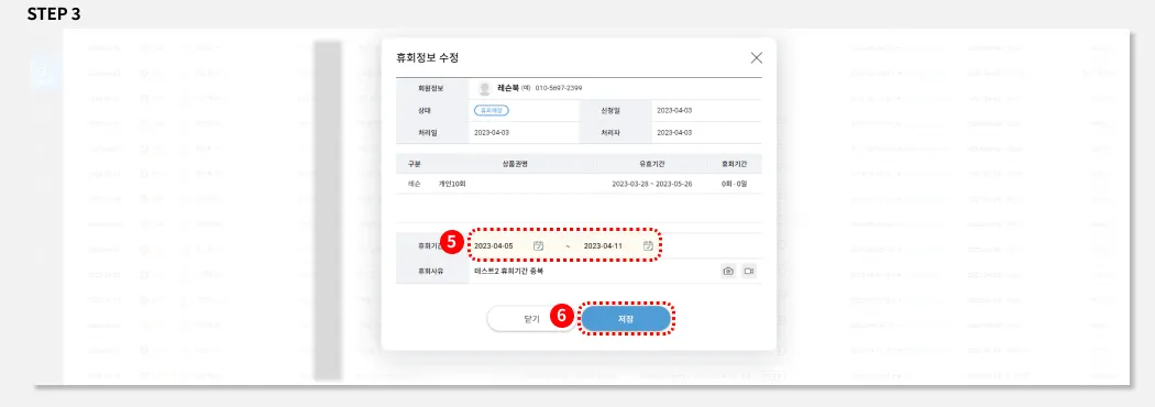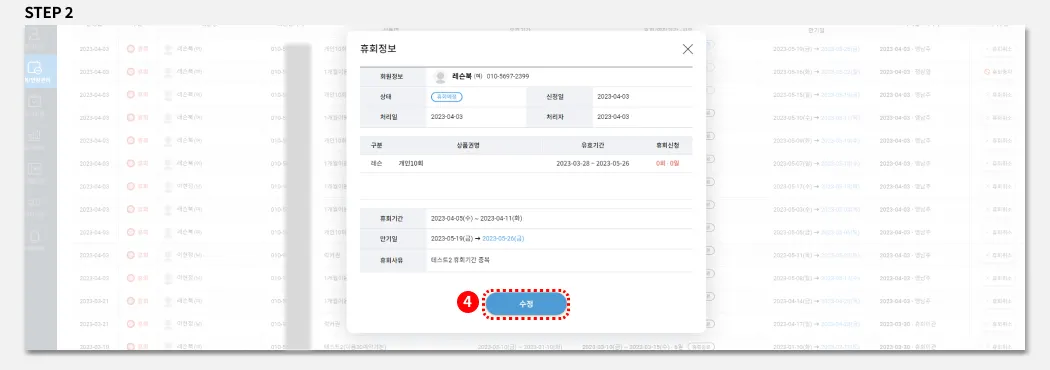휴회등록한 회원의 휴회정보의 수정이 필요한 경우, 휴회의 수정을 할 수 있습니다.