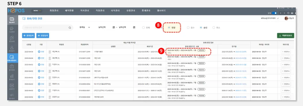 휴회등록을 선택해, 연장등록 팝업창을 불러옵니다.