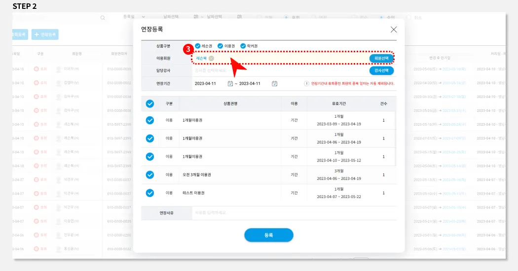 연장등록 팝업에서, 이용회원을 검색해 입력합니다.