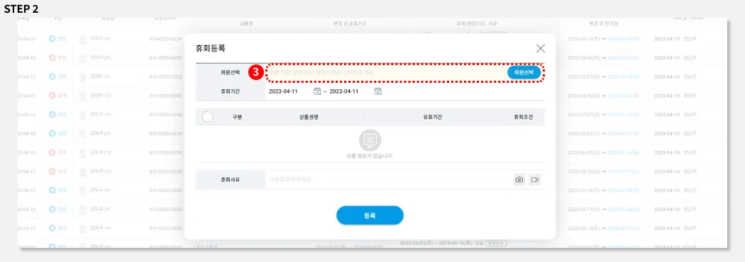 회원상세 페이지에서, 휴회/연장등록 버튼을 선택해, 휴회/연장등록 팝업창을 호출합니다.