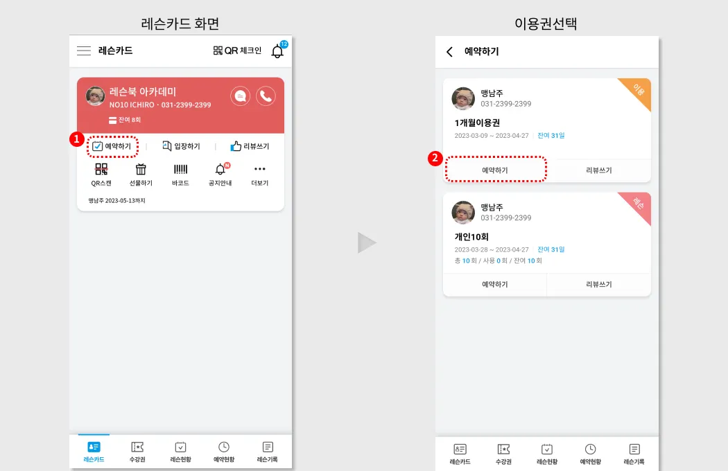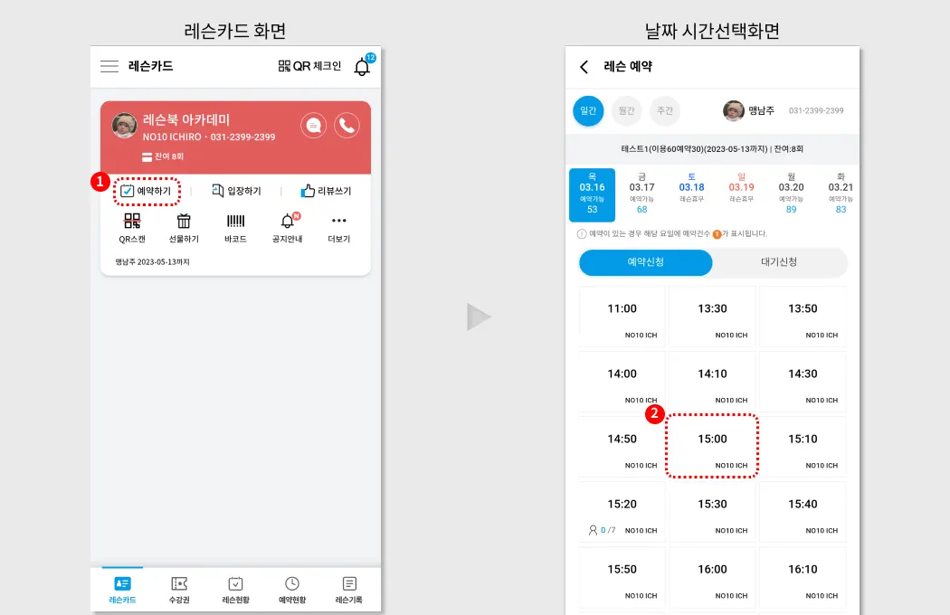 레슨카드 > 예약하기 > 날짜/시간선택 > 완료 순으로 레슨예약을 합니다.
