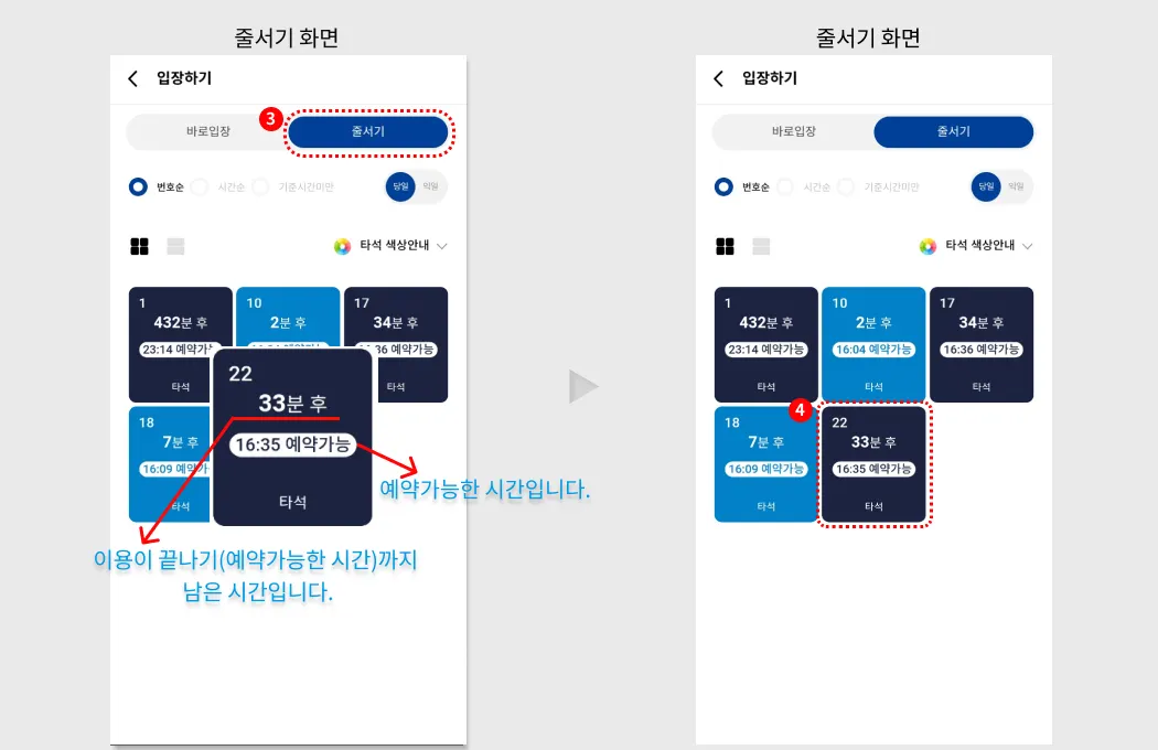 3에서 시간을 확인하신 후, 타석을 선택해 줄서기(입장대기)예약을 완료합니다.