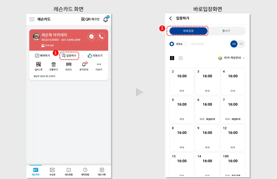 레슨카드 > 입장하기 > 줄서기 (당일 입장대기예약(줄서기)기능을 사용하는 센터의 회원)