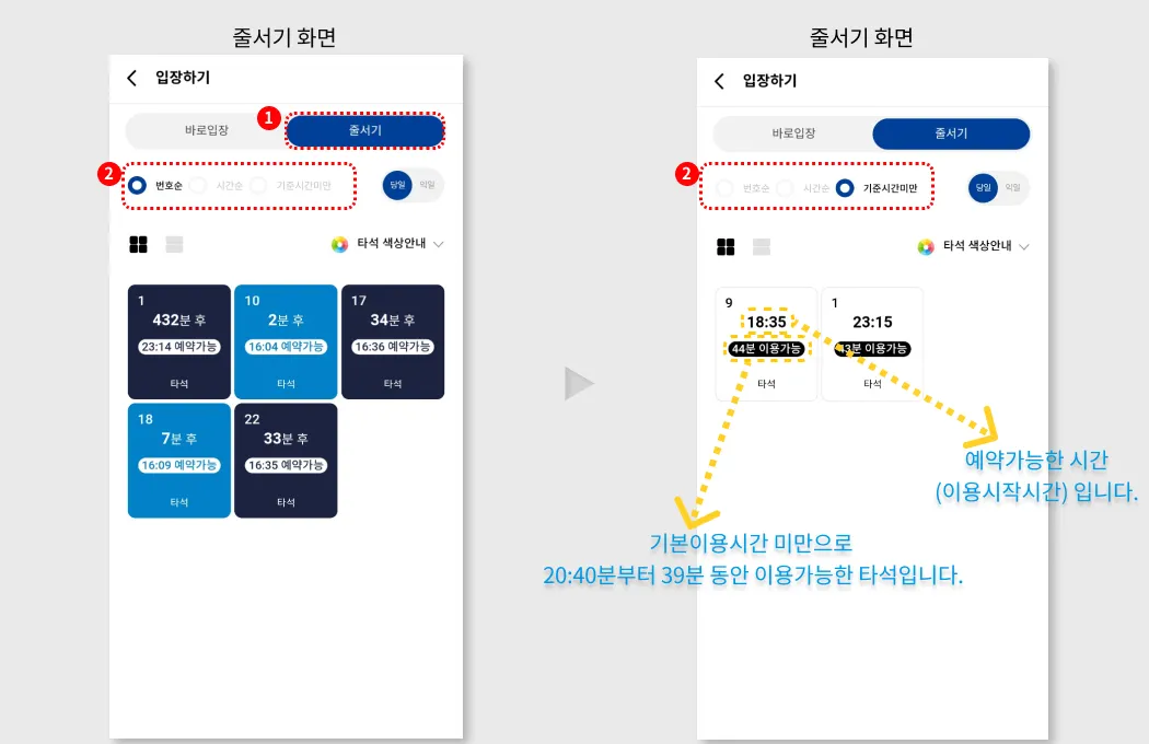 : 현재 이용중인 타석확인. 현재 이용중인 타석 뒤에 줄서기(입장대기) 예약을 할 수 있습니다.