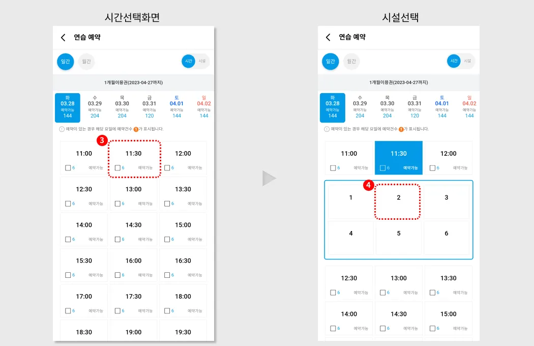 레슨카드 > 예약하기 > 날짜/시간선택 > 시설선택 > 완료 (시설을 예약하는 음악학원, 필라테스, 골프연습장 등의 센터회원)