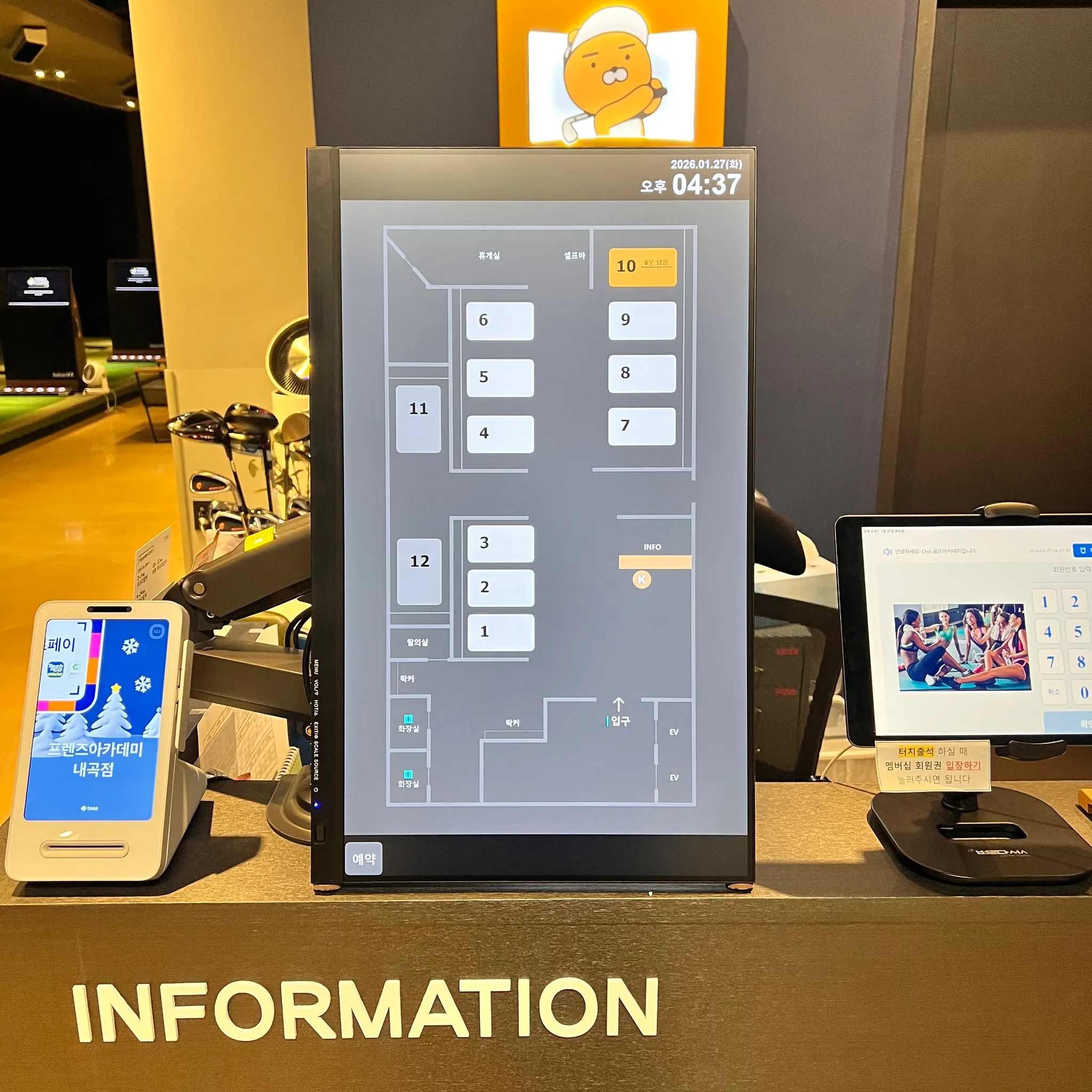 레슨북 시그니처 : 매장의 레이아웃을 그대로, 회원은 자신이 원하는 타석의 위치를 직관적으로 확인가능합니다. 타사의 키오스크에 레슨북 프로그램을 설치했습니다.