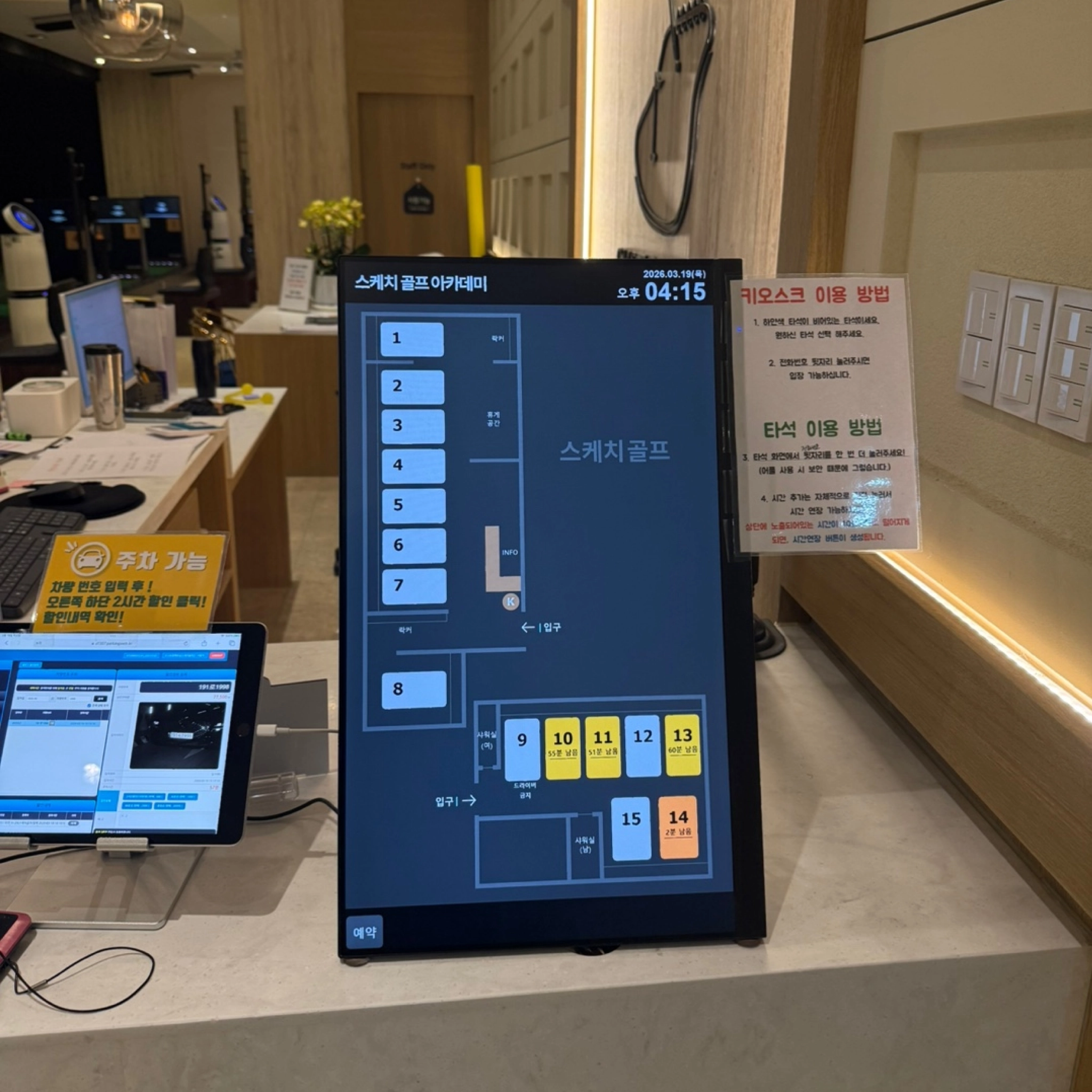 이제 회원은 직원을 통해 이용하는 것이 아니라 키오스크에서 직접 배정하고 원하는 타석을 선택해 이용합니다. 누군가 배정해주는 방식이 아닌 회원이 스스로 이용하는 구조로 바뀌면서 대기와 문의가 자연스럽게 줄어들었습니다.