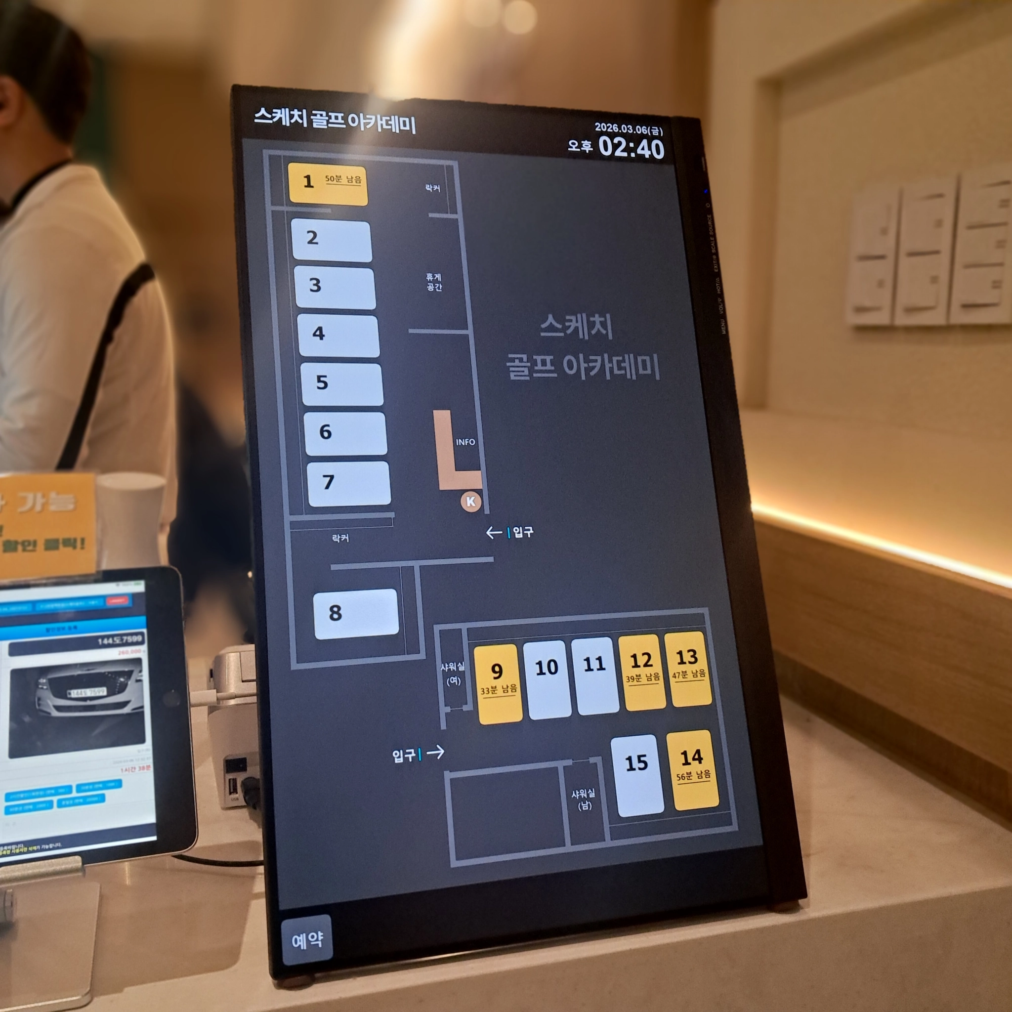 레슨북 시그니처 : 매장의 레이아웃을 그대로, 회원은 자신이 원하는 타석의 위치를 직관적으로 확인가능합니다. 타사의 키오스크에 레슨북 프로그램을 설치했습니다.