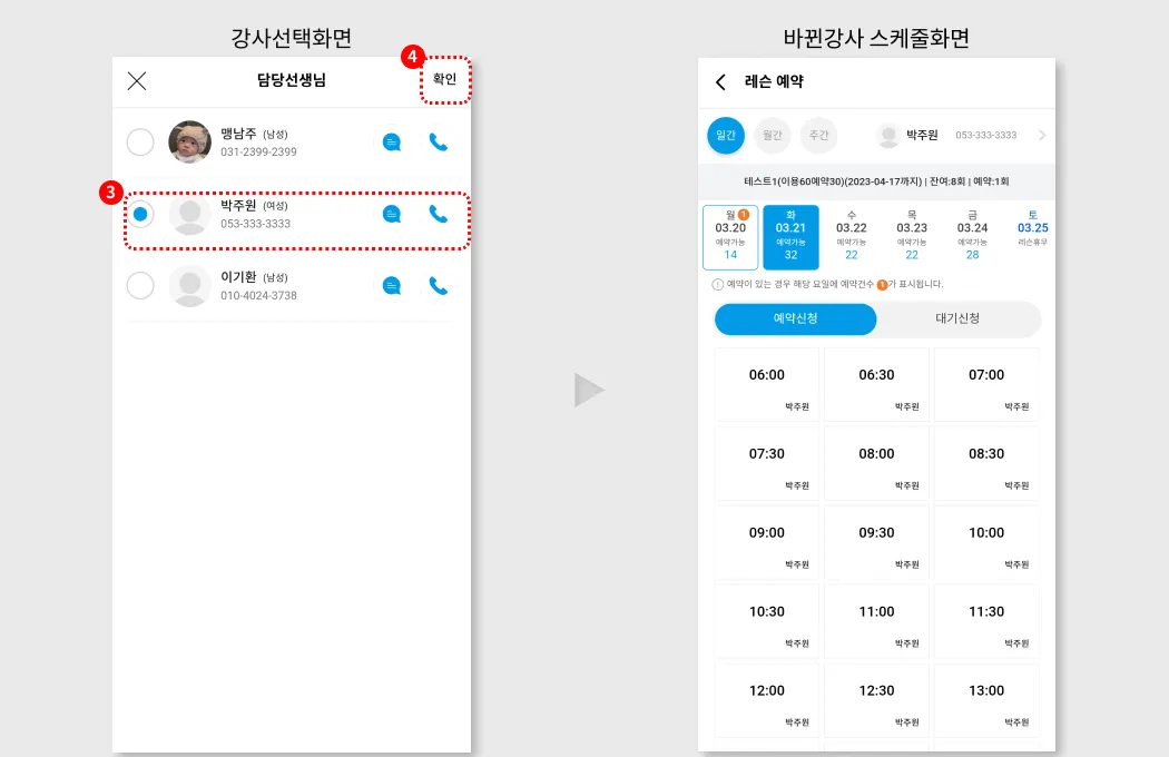 예약하기 > 네임택선택 > 강사선택 > 예약하기 (보유한 수강권이 강사를 변경할 수 있게 설정되어 있는 수강권이라면, 강사를 바꿔서 예약할 수 있습니다)