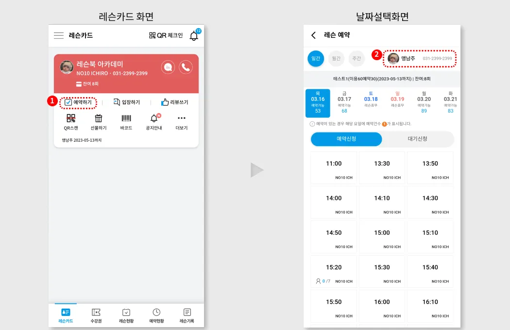 강사를 바꾸서 예약하기는, 회원이 보유한 레슨권이 강사변경이 가능한 레슨권이어야 합니다. 강사변경이 불가능한 레슨권을 보유한 회원은, 담당강사 외, 다른 강사님에게 레슨예약을 할 수 없습니다.