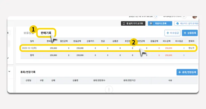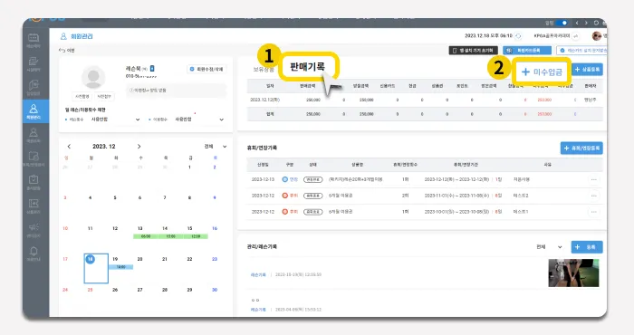 미수입금을 완료하면, 판매 기록에서 미수입금내역 등을 확인할 수 있습니다.