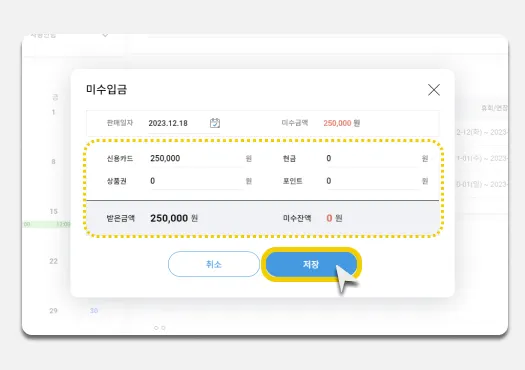 구매 금액을 확인하고, 회원이 결제한 금액을, 결제방법에 따라 입력합니다. (미수금액 0원으로 만듭니다)