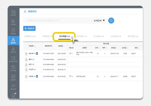 회원관리 ‘미수회원’탭을 선택하시면, 미수금(미결제회원)을 확인할 수 있습니다.
